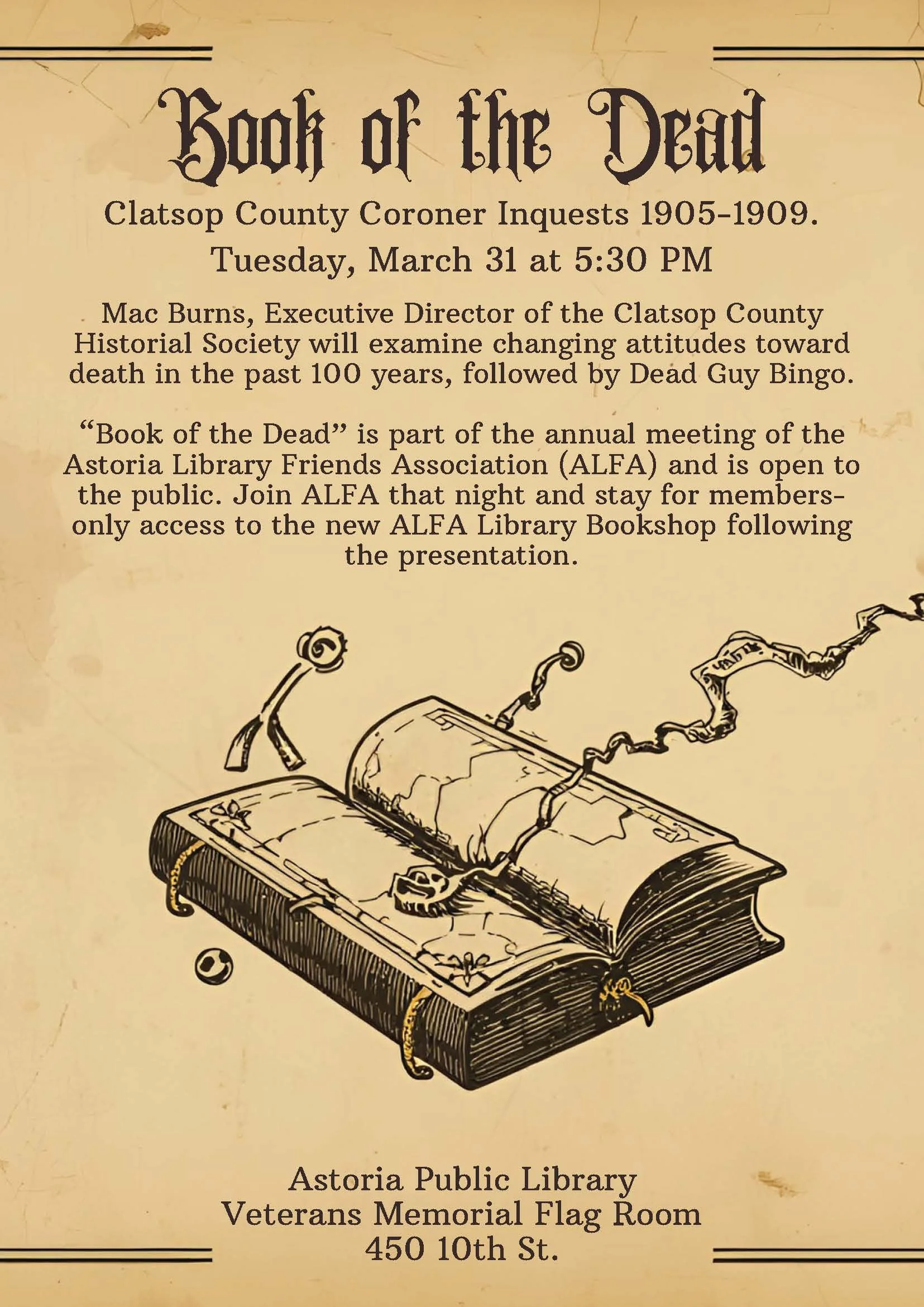 A brief informational and business meeting will be followed by The Book of the Dead, a presentation by Mac Burns chronicling Astoria's more colorful coroner's reports.